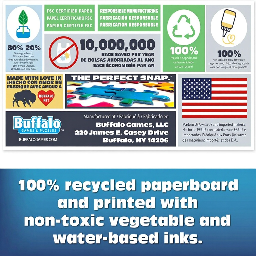 Il puzzle è realizzato negli Stati Uniti con materiali riciclati, assicurando qualità e sostenibilità nella produzione.